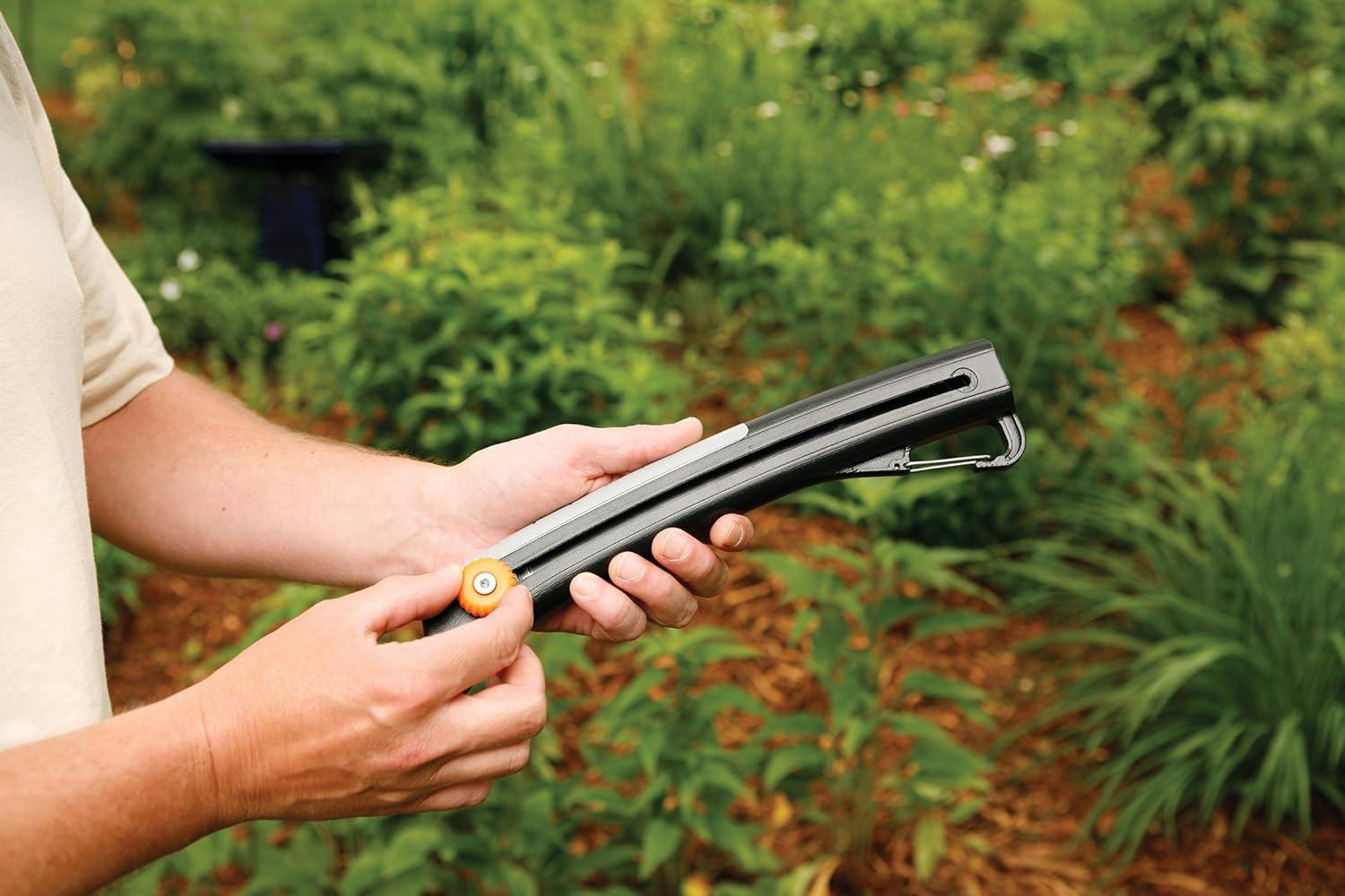 Product Description Fiskars Power Tooth Sliding Carabiner Saw is a great choice for anyone on the go. A razor-sharp, triple-ground Power Tooth blade cuts wood on the pull and push stroke to help you cut through branches with speed and efficiency, and the fully hardened, rust-resistant steel blade stays sharp longer than others. When you're done, the blade slides into the tough DuraFrame handle for safe transportation and storage. For comfortable use, a Softgrip handle pad helps reduce hand fatigue. You can even use the built-in carabiner clip to attach this saw to your belt, so it's always easy to access when you need it. From the Manufacturer A convenient variation of top-selling original, this versatile saw is big enough to tackle 4-Inch branchens, then slides into a handy carabiner handle that clips conveniently to belt or tool bag. The 10-Inch Power Tooth stainless steel blade cuts on the push and pull stroke for quick, clean, healthy cuts. When the job is done, simply slide the blade safely into the sturdy, lightweight Fiber Comp handle.