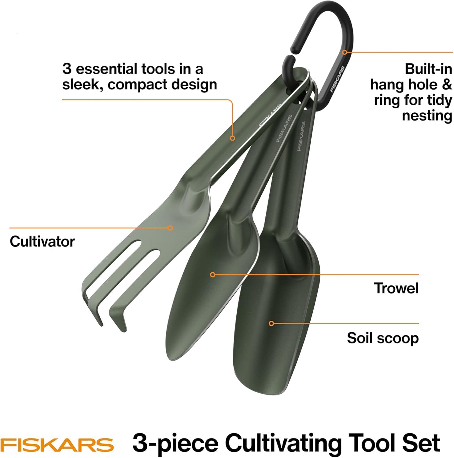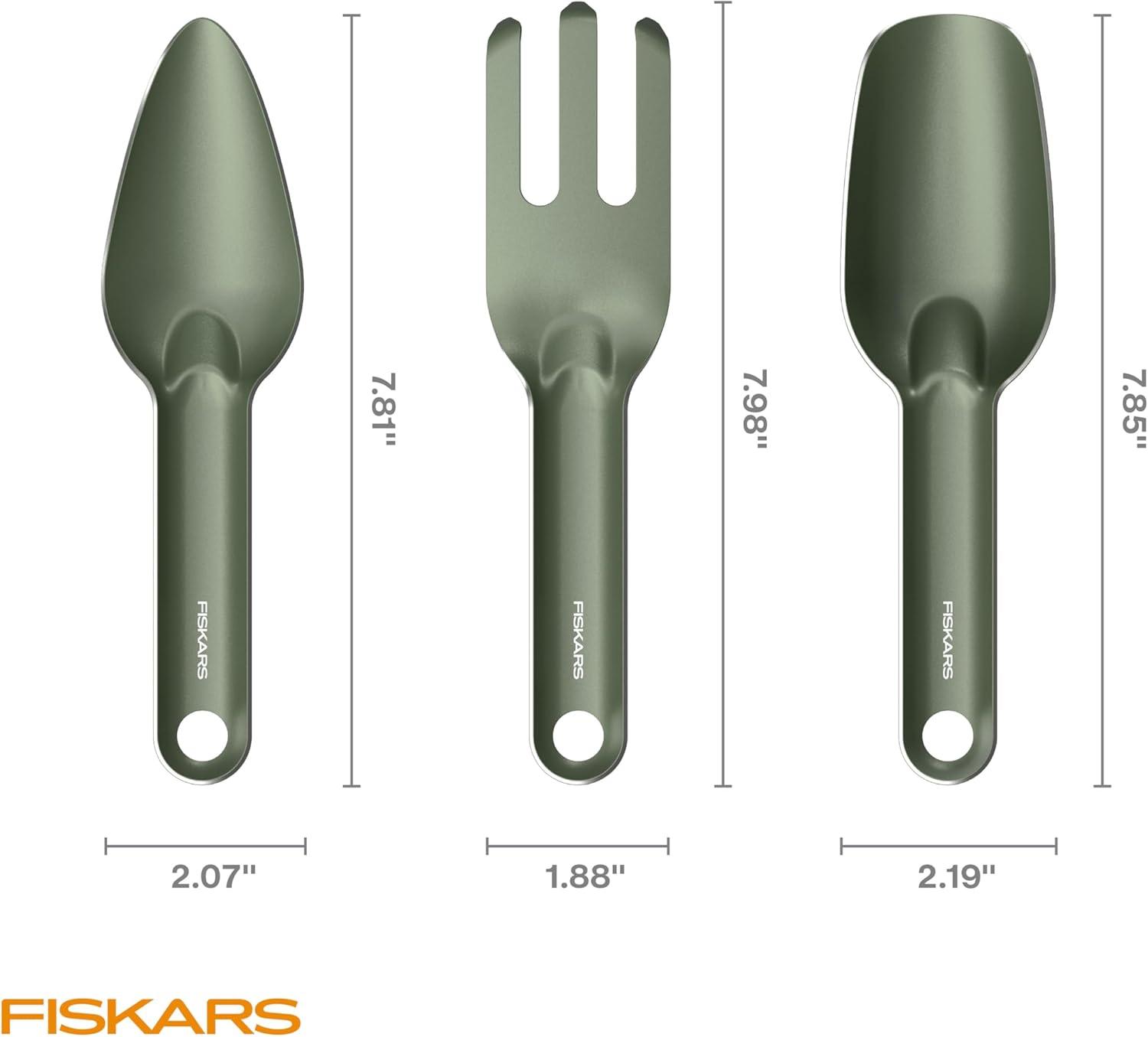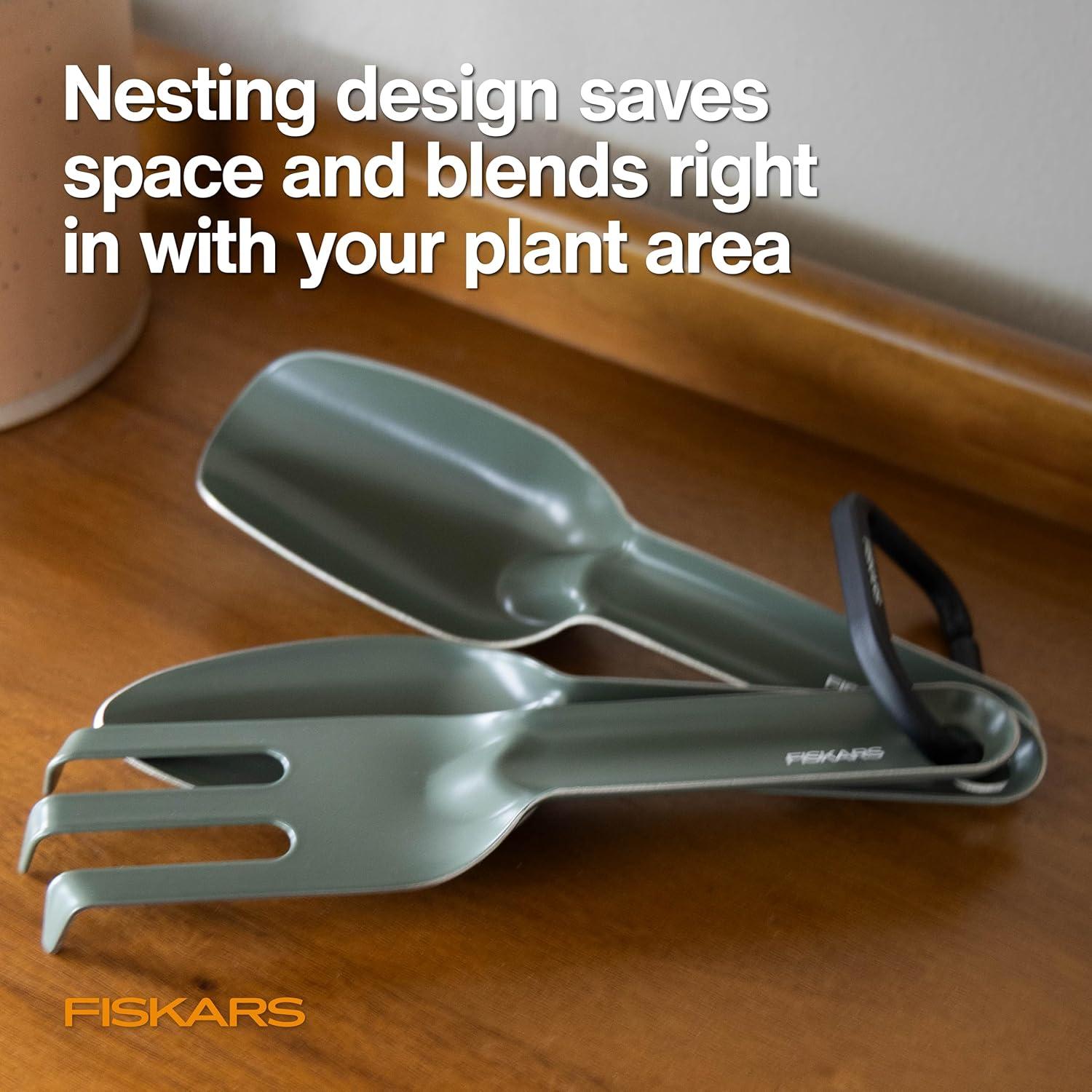 SPACE-SAVING 3-IN-1 SET: Trowel, scoop and cultivator nest together to minimize clutter and keep essentials at hand.