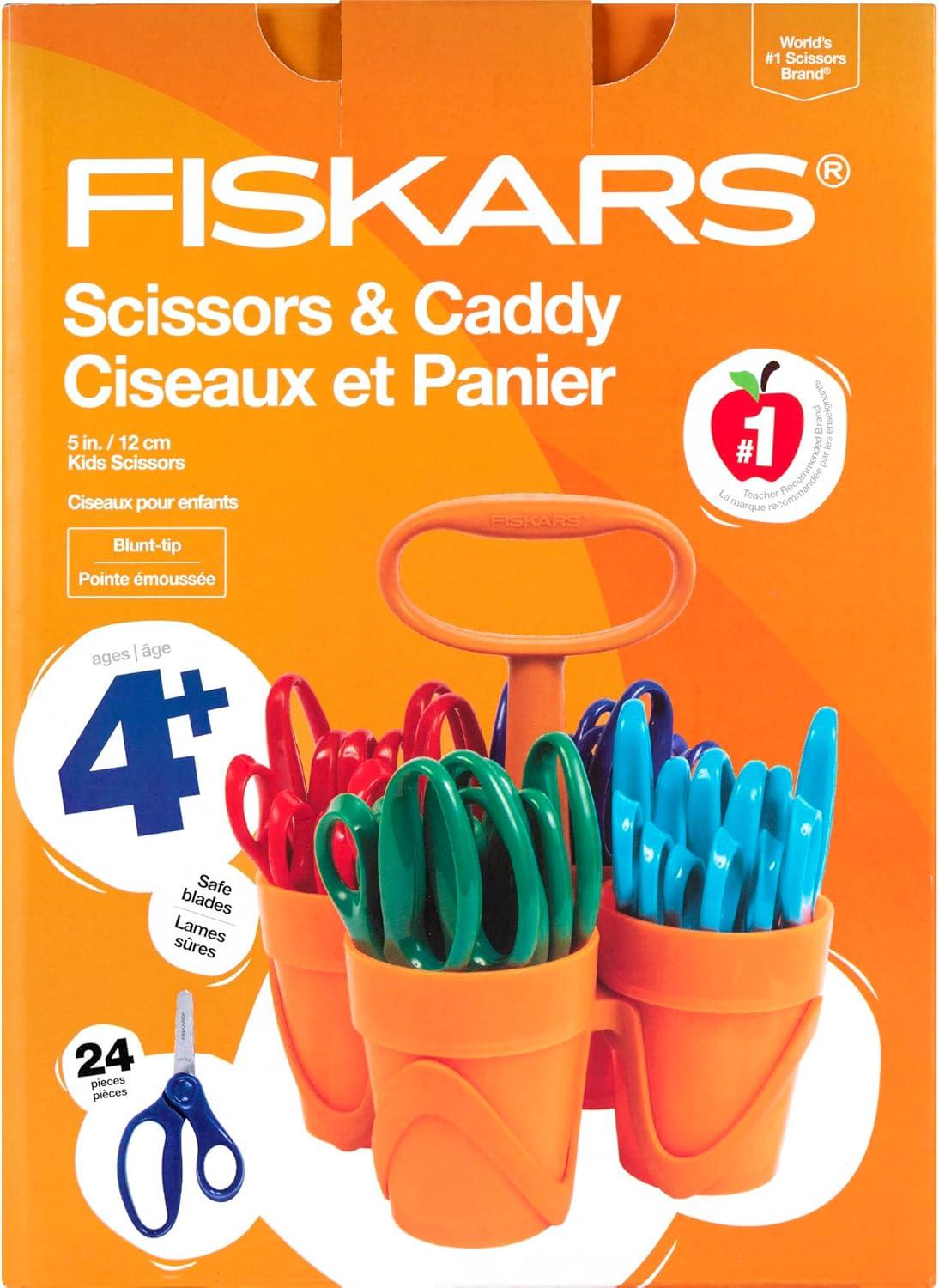 SCHOOL SUPPLIES FOR KIDS 4+: Fiskars 24-pack of blunt tip scissors and desk caddy organizer with four removable cups to divide scissors and classroom art supplies among groups; Ideal for kids ages 4-7; #1 teacher-recommended brand