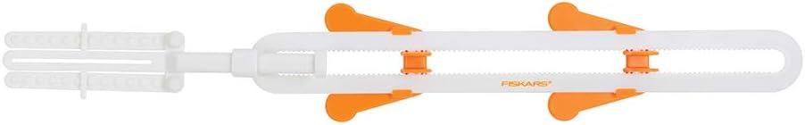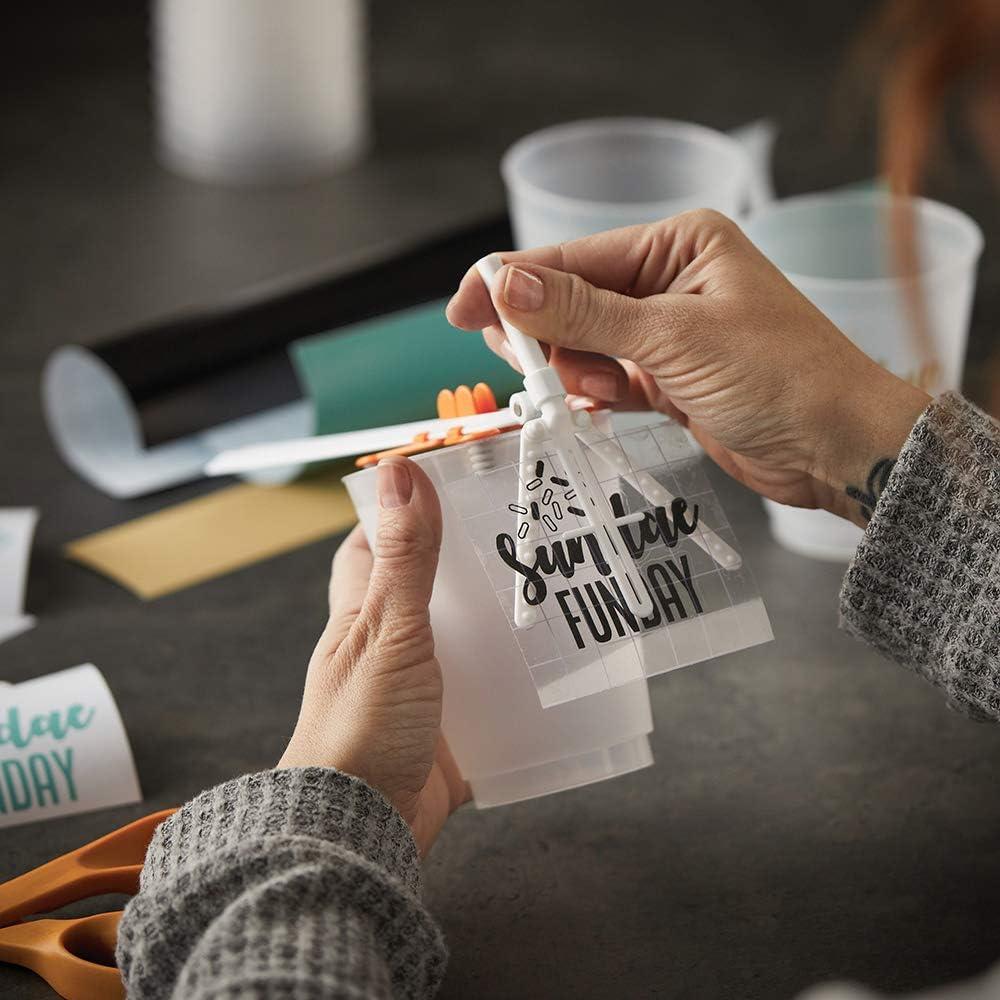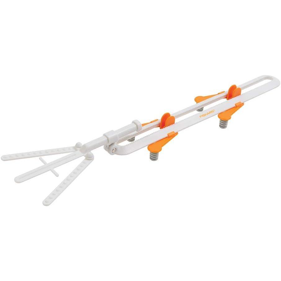 Fiskars Curved Vinyl Alignment Tool horizontally and vertically aligns vinyl for straight, accurate placement on curved surfaces. Ideal for consistent, repeat placement across multiple projects, this tool features rubber feet that grip securely onto curved work surfaces without causing damage. Locking tabs flex to adjust the distance between the feet to fit the diameter of the object, while the adjustment bar adapts for decal placement at varying heights. A crossbar serves as an additional straight reference point, while raised dots on the fingers reduce surface area contact for easy vinyl removal. The adjustment bar and arms also fold under the rail for compact storage. Great for vinyl up to 5 by 2 inches on curved surfaces with a diameter range of 1_� to 7_�, this tool works on most transparent, translucent and opaque work surfaces, including glass, ceramic, plastic, metal and more.
