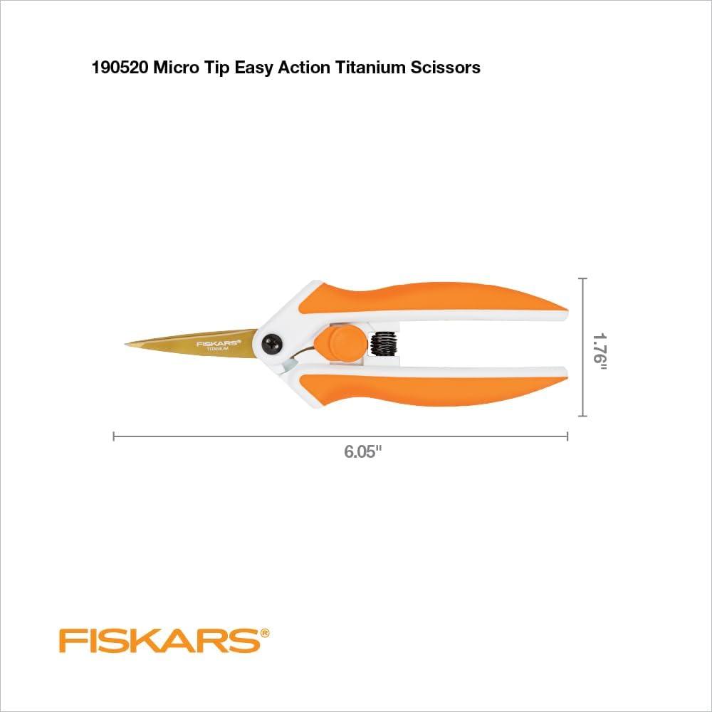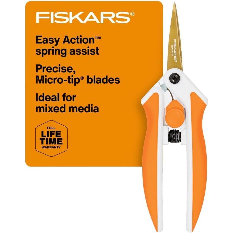 LONG LASTING AND RELIABLE: Titanium blade coating makes these craft scissors three times harder than steel and able to resist wear, scratches, and corrosion; Fiskars craft supplies and materials are built to last