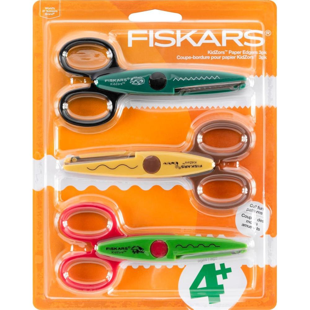 Add fun and flair to every craft project with Fiskars Kidzors Paper Edgers. This 3-pack of decorative scissors allows kids to create unique borders and patterns for cards, scrapbooks, and paper crafts. The kid-friendly stainless steel blades cut through paper, cardstock, and foil with ease, while the colorful handles make them easy to identify. Designed for right- and left-handed users, these scissors are perfect for children aged 4 and up. Whether designing collages or homemade cards, Fiskars Kidzors Paper Edgers bring creativity and excitement to every snip.