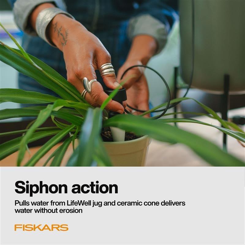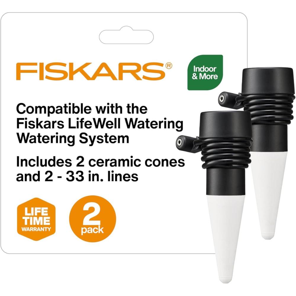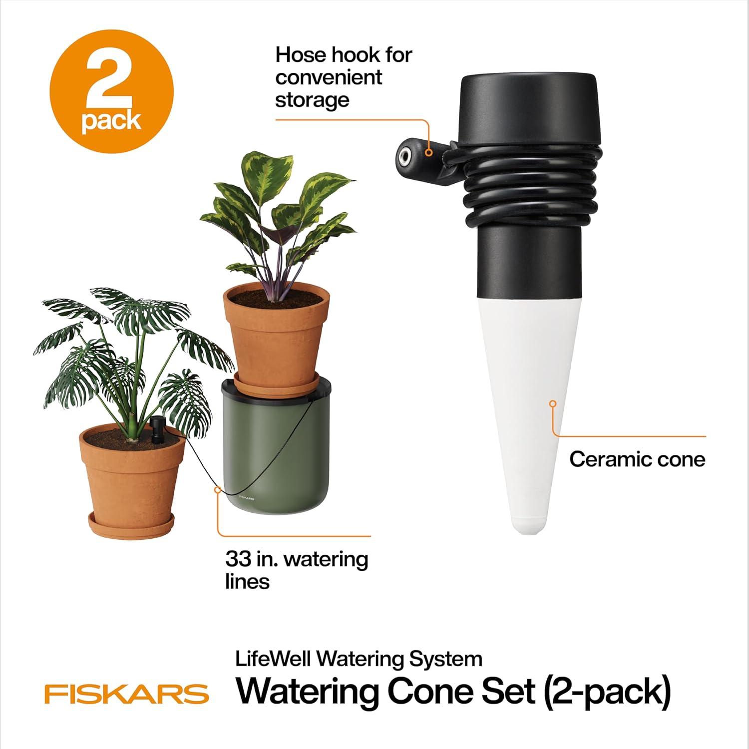 Ready-to-use 2-pack: Includes 2 Watering Cones and hose; for best performance, use filtered water. Covered by a limited product warranty (see Fiskars.com/USwarranty for details).