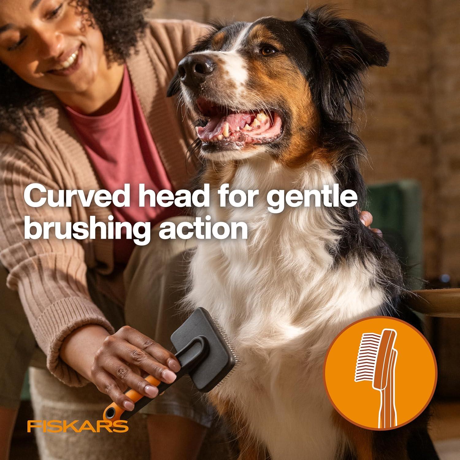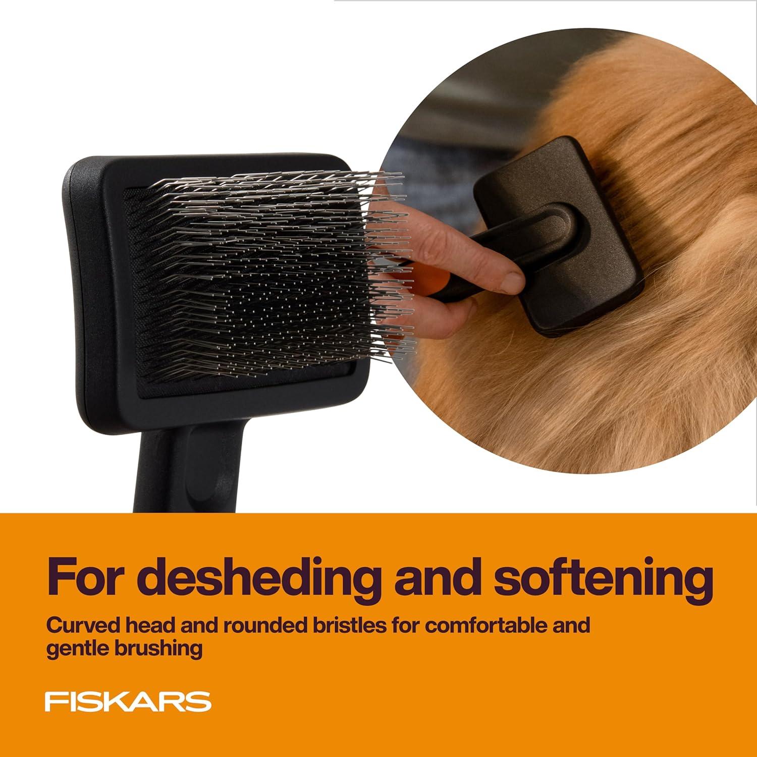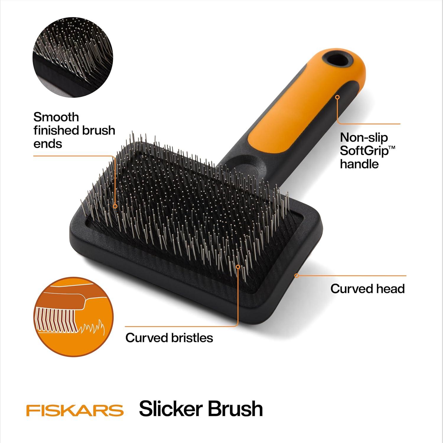 Groom your pet gently and effectively with the Fiskars Slicker Brush. As a trusted name in quality tools, Fiskars brings thoughtful design to pet care with this brush. The fine bristles have finished ends to be extra gentle on your pet's skin, and the curved head makes brushing easier. Made from durable, easy-to-clean materials, this brush is designed for deshedding and softening your pet's coat. Because every pet deserves Fiskars.