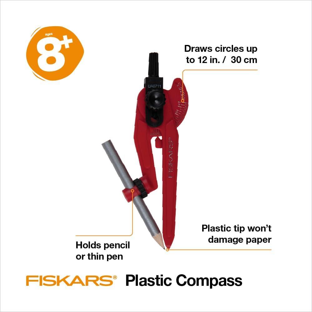 INCLUDES: Fiskars Plastic Safety Point Compass with pencil; Color received may vary; Full lifetime warranty