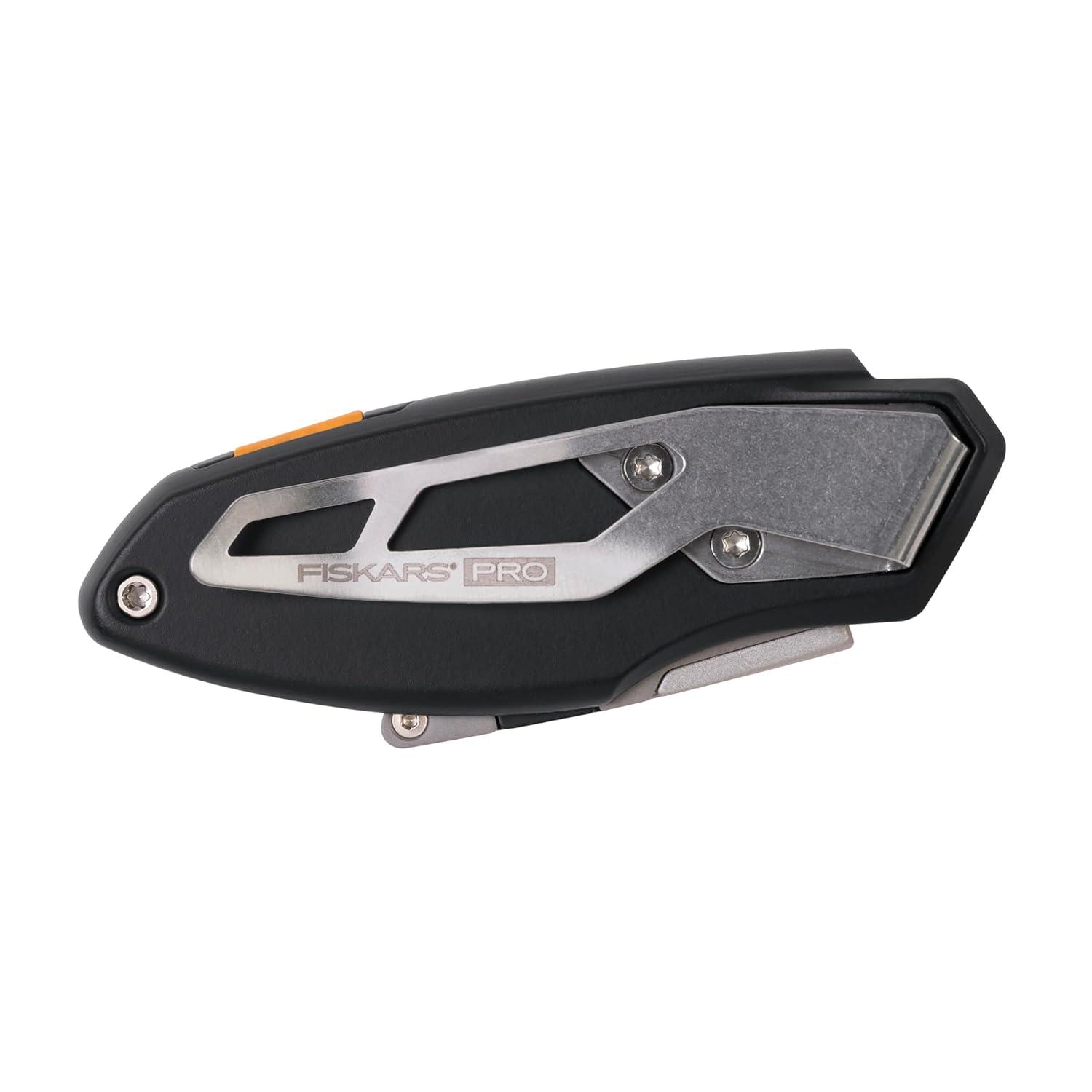 Keep this Fiskars Pro Mini Folding Utility Knife on hand for various cutting tasks. This compact knife offers all the functionality of a standard utility knife in a pocket-friendly size. The ergonomic, textured grip ensures a secure and comfortable hold, while the one-handed opening mechanism allows for quick blade deployment. A dual-locking blade mechanism prevents accidental blade release during use and ensures a secure blade lock. Easy blade changes are made possible with the front-loading design. The knife features a durable metal build with a reinforced metal end for added strength. A handy pocket clip allows for easy carrying and quick access to the knife whenever you need it.