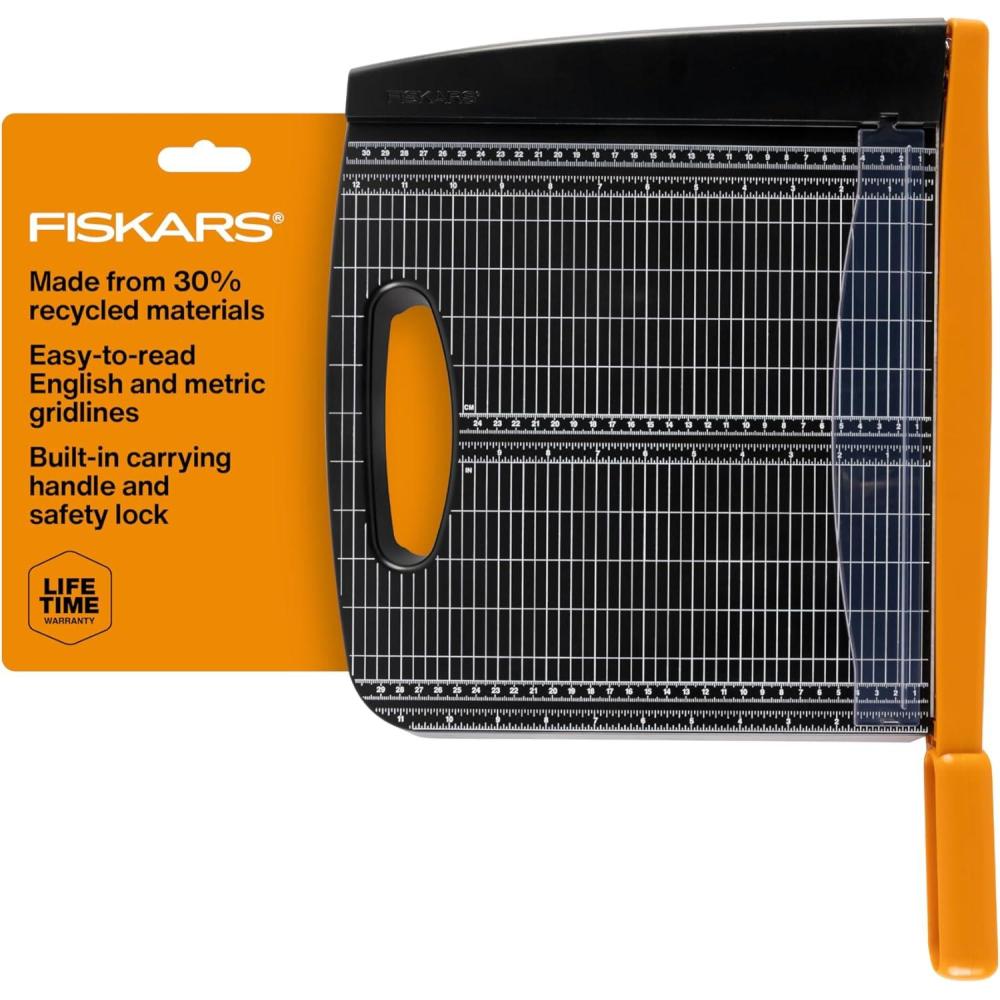 SEWING, ARTS, AND CRAFTS STAPLE: Fiskars Recycled Bypass Paper Trimmer features a self-sharpening, bypass blade, and a 12″ deck made with post-consumer-recycled materials