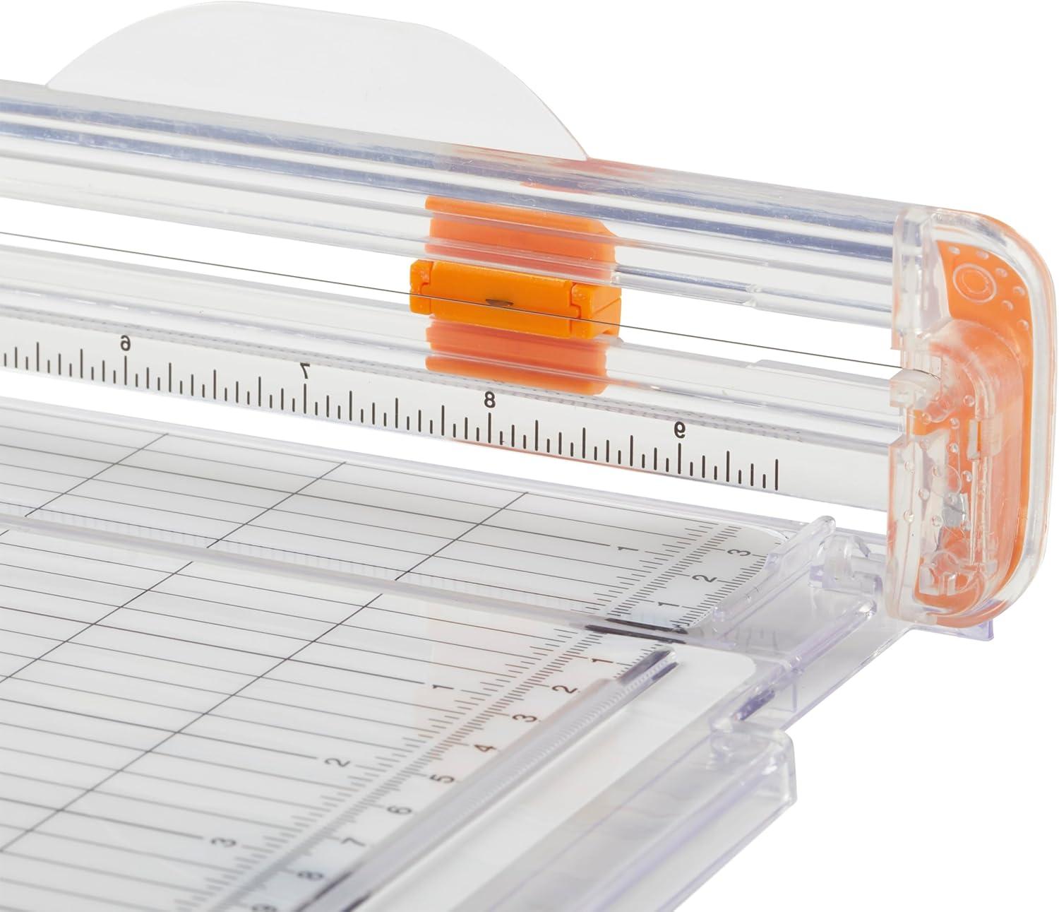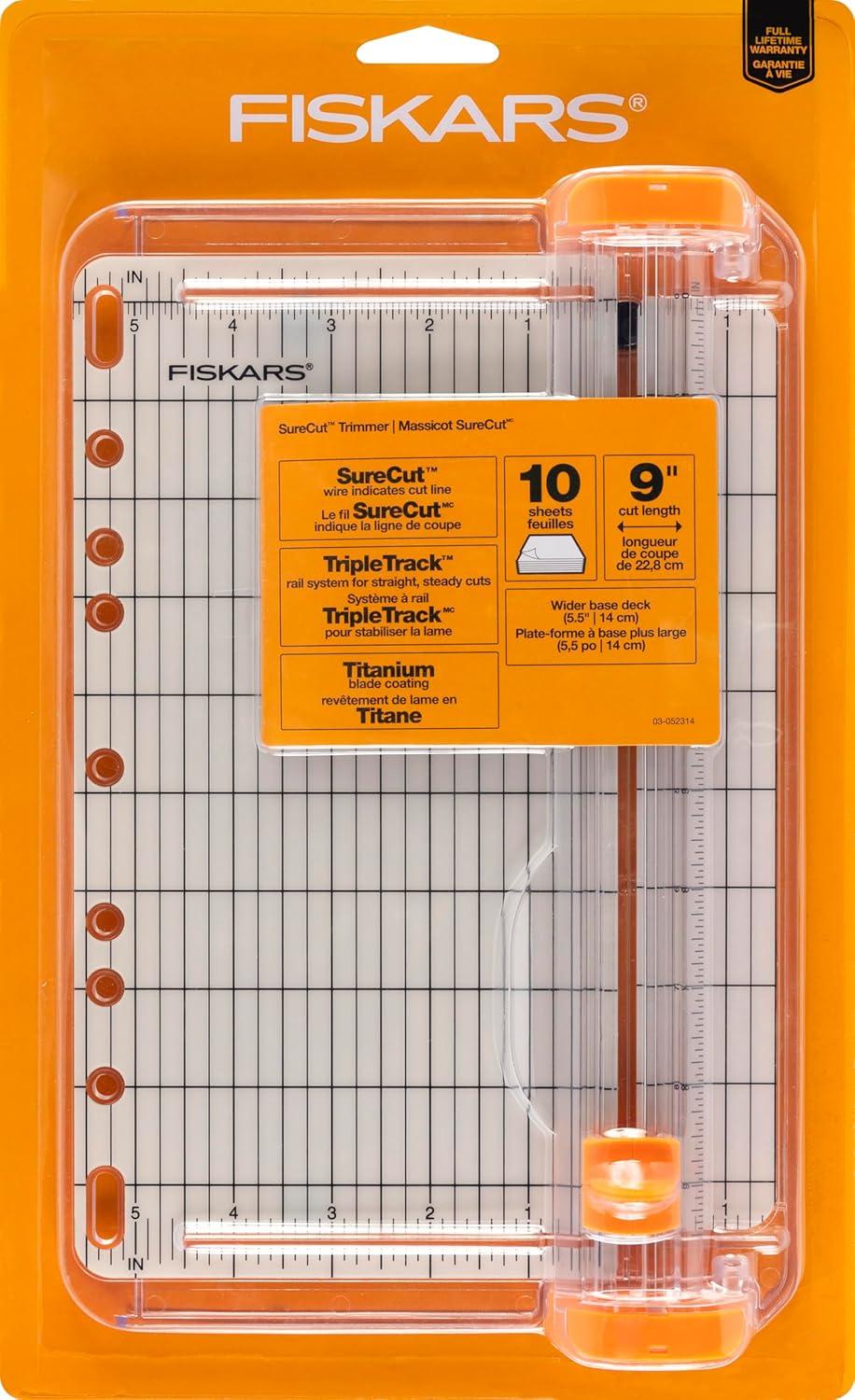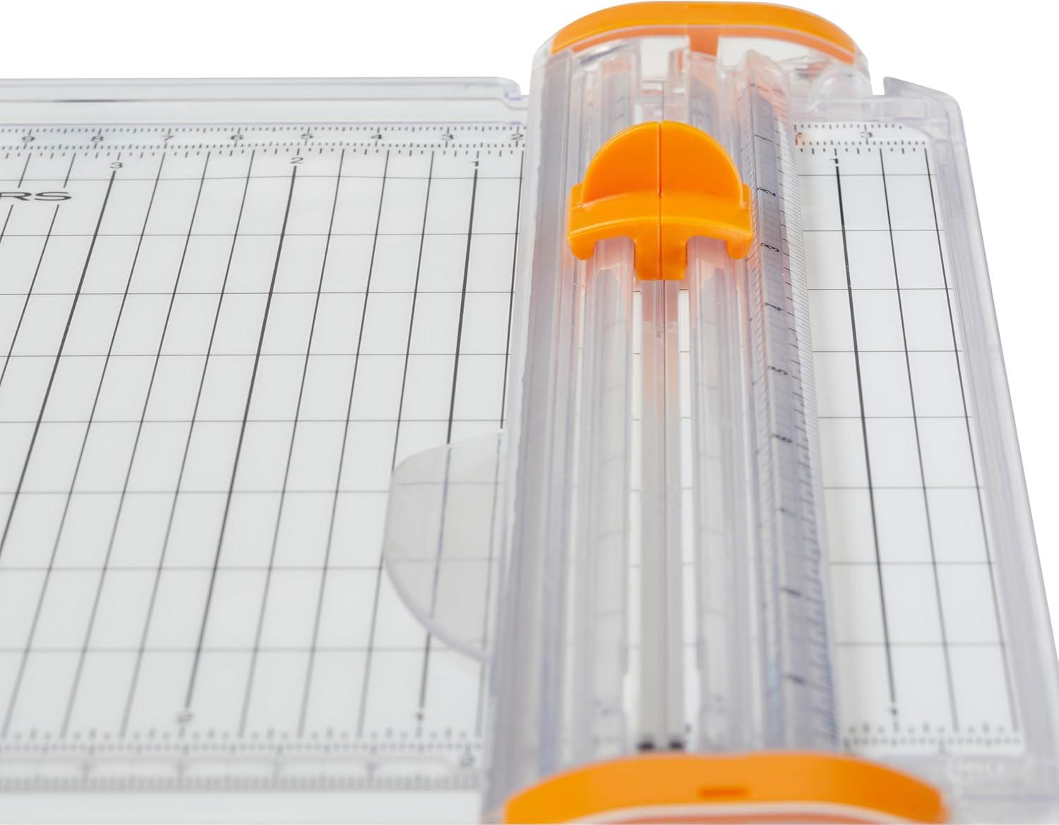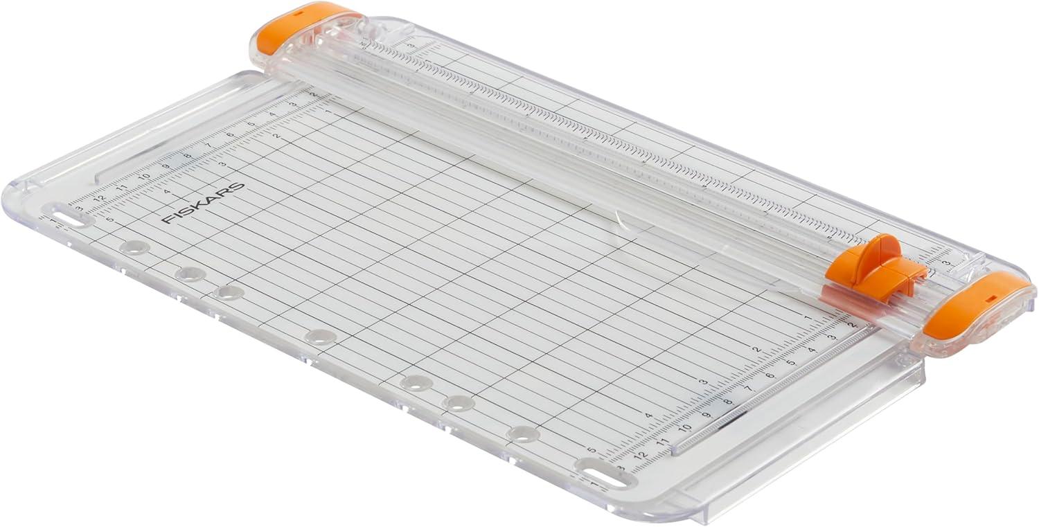 The ultimate in compact cutting quality and convenience for card-making enthusiasts! The SureCut Card Making Paper Trimmer For Crafting delivers the Fiskars performance you know and trust in a portable paper trimmer for crafting on the go. Bring it along to card-making and crafting events or simply to be able to cut and create in a small space. The SureCut wire cut-line indicates exactly where the blade will cut your card-making materials while the TripleTrack System interlocks the blade and rail for straight, precise cuts every time. A permanent scale and grid cutting mat helps ensure cutting accuracy. An ergonomically designed, high-profile blade carriage is easy-to-grip to help you make accurate cuts quickly. It even includes a lightweight, compact design and built-in three-ring binder holes, making this trimmer one of the most conveniently portable units on the market.