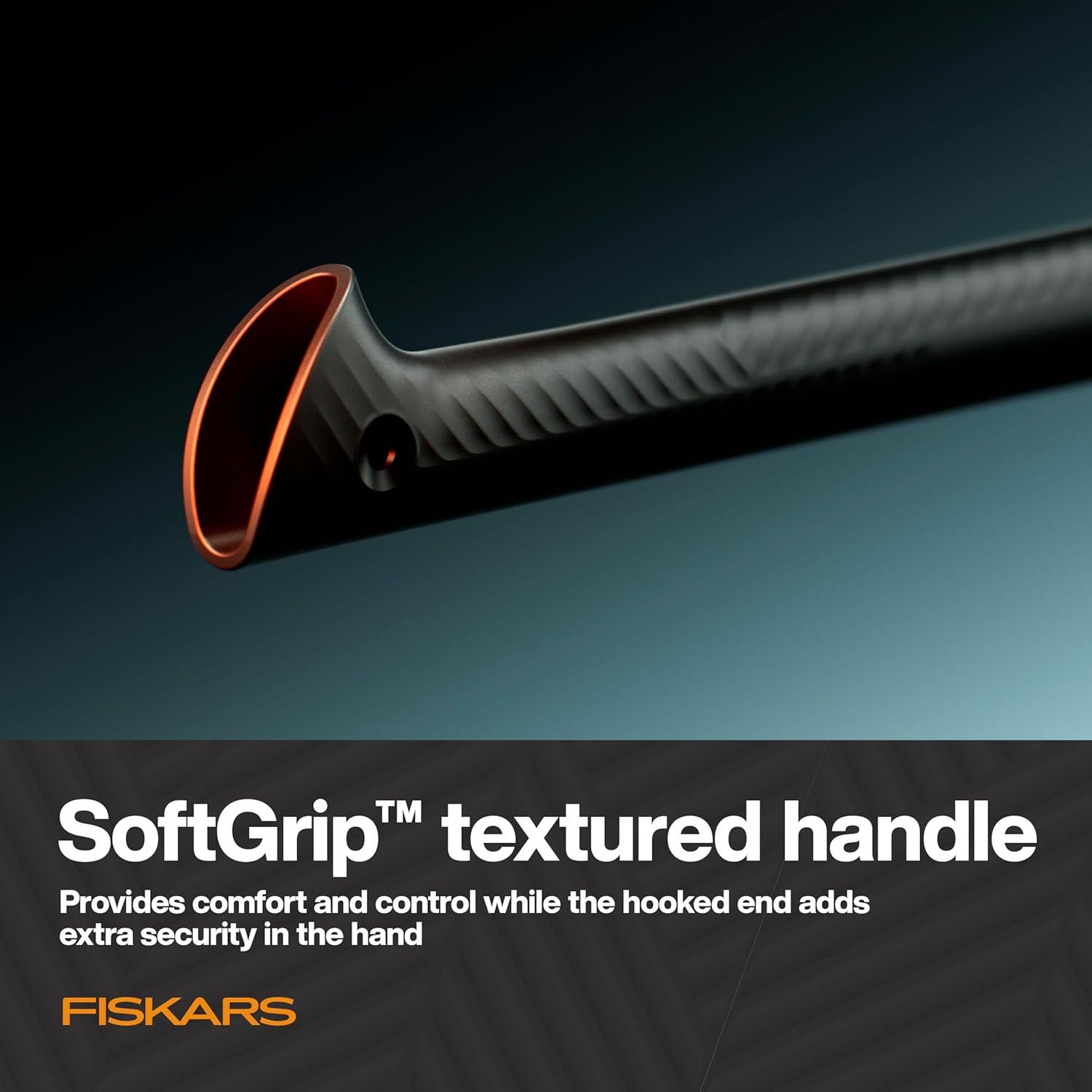 SECURE, ERGONOMIC CONTROL: Textured SoftGrip handle with hooked end helps keep the axe firmly in hand; insert-molded head reduces loosening and overstrike breakage.