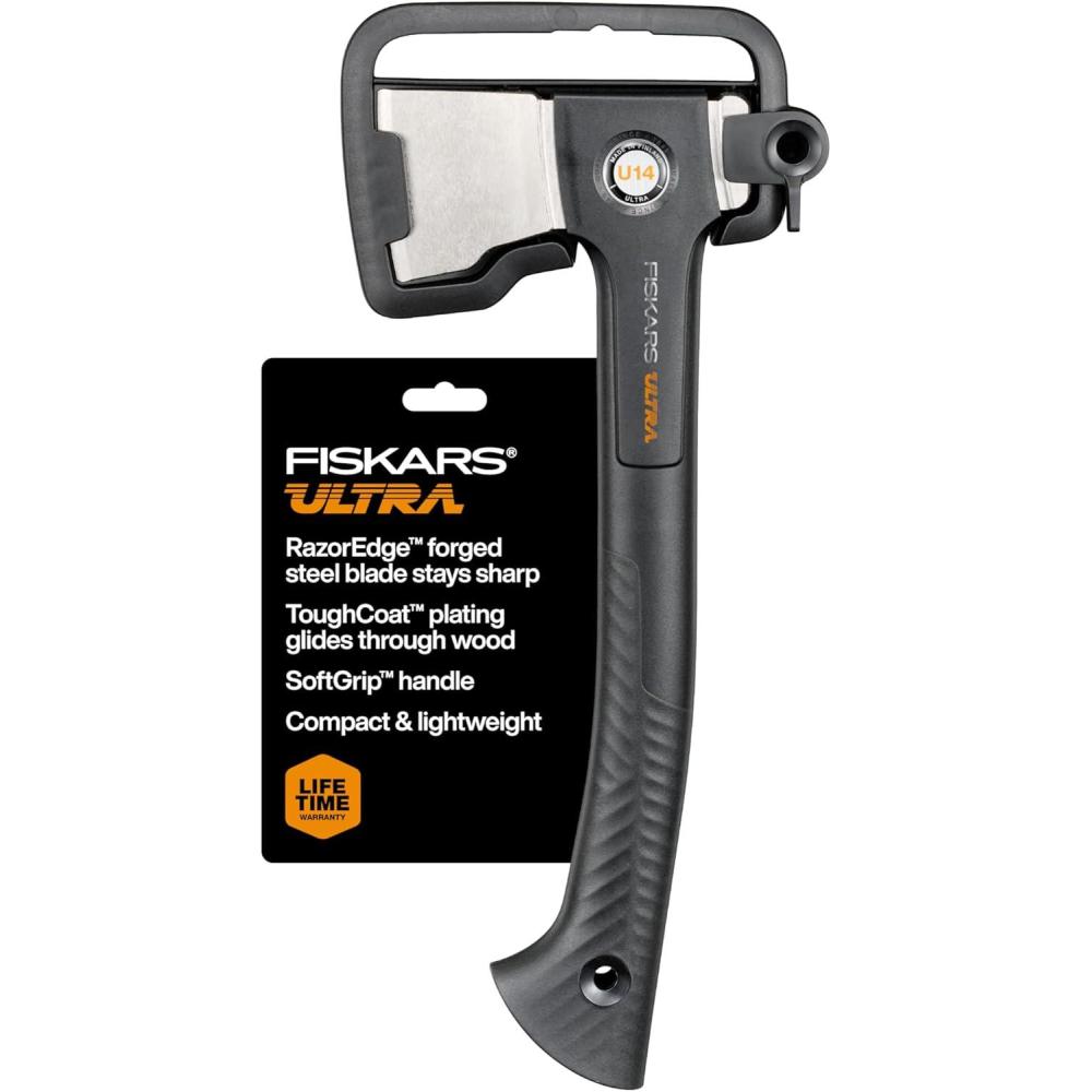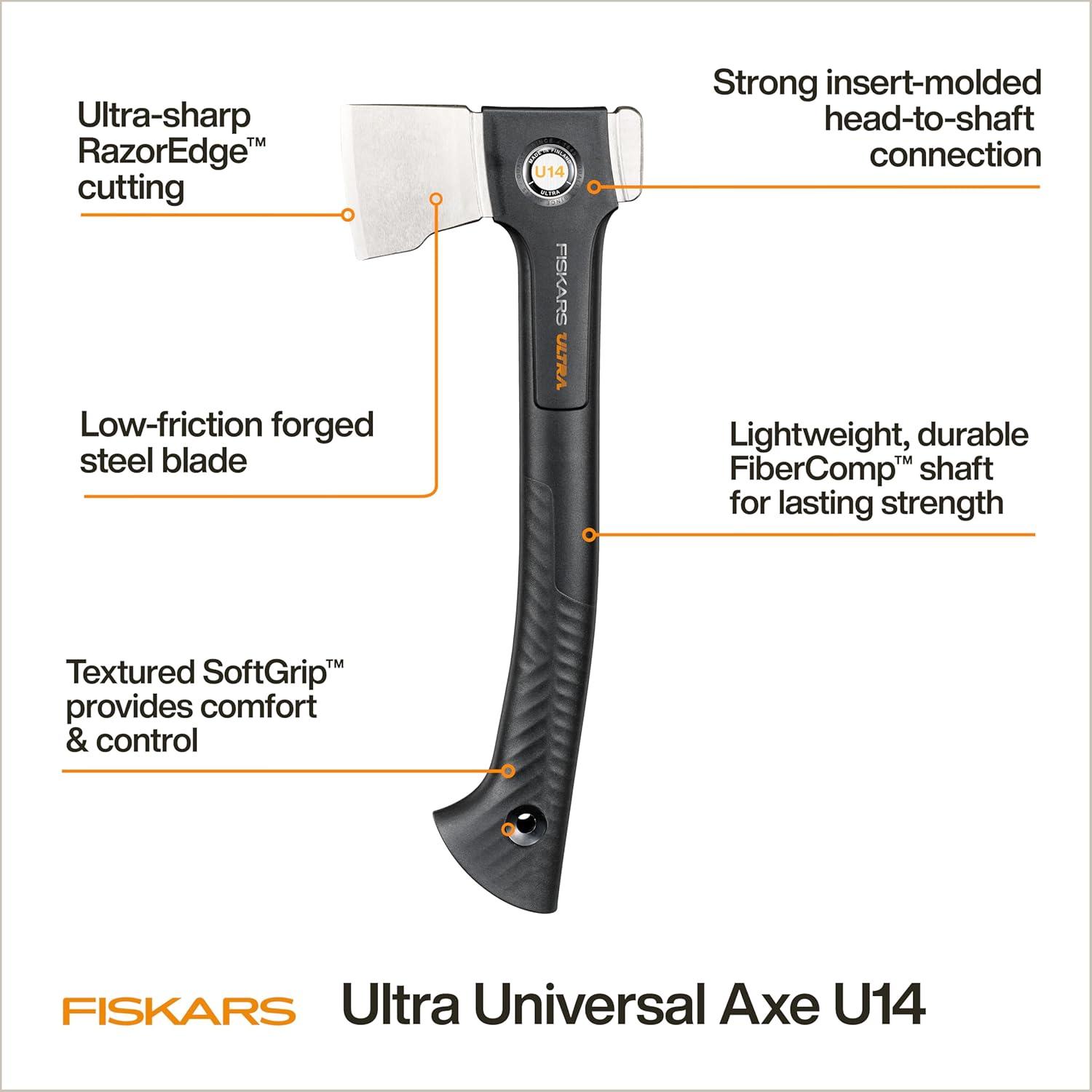From kindling to clearing, the Fiskars Ultra Universal Axe U14 is the ultimatet compact, all-purpose tool for your outdoor tasks. Its precision-ground RazorEdge™ blade is honed from double-hardened, forged steel to stay sharp through heavy use. A perfected weight balance adds power and control to every swing, while the advanced ToughCoat™ plating allows the blade to glide through wood with less friction and superior wear resistance. Built to last, the Universal Axe has a stronger insert-molded head-to-shaft connection paired with a lightweight and durable FiberComp™ shaft for lasting strength and superior overstrike protection. A textured SoftGrip™ handle provides comfort and control, while a hooked end adds security. Includes a protective sheath to keep the blade safe during transport and storage.